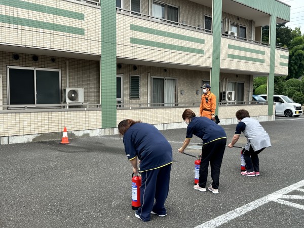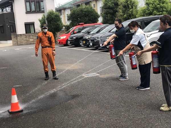 職員達が実際に消火器を使用して消火訓練してみました