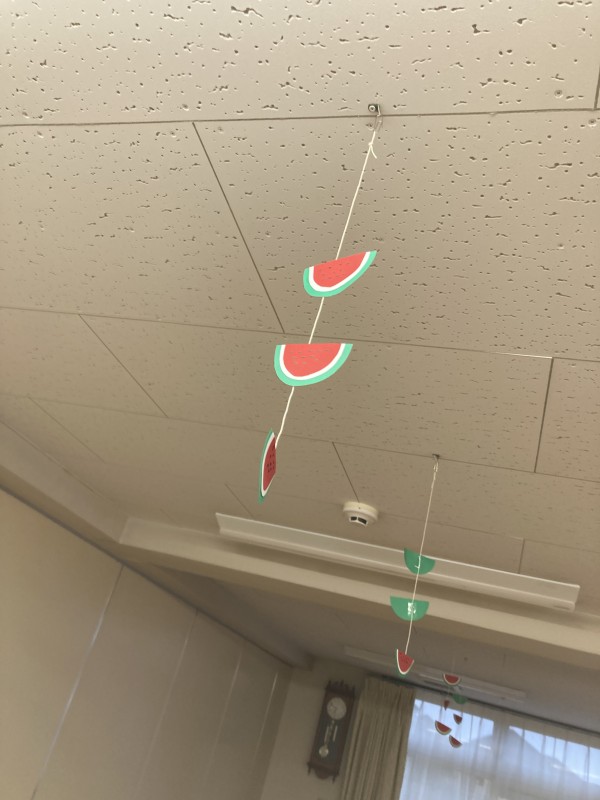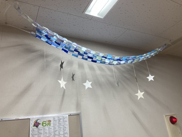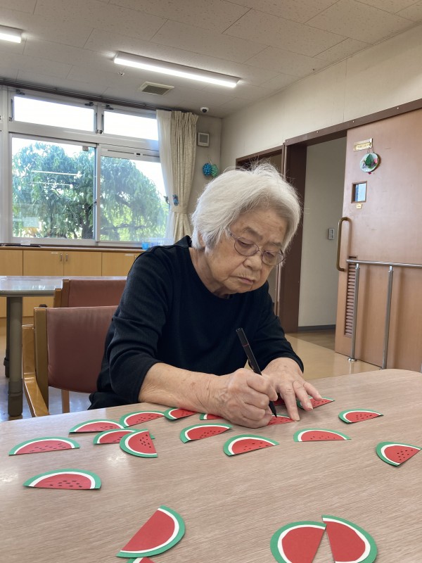 今日は色紙で制作が始まりましたよ~。スイカに天の川…色紙で作ったといえ見ていて涼しくなってきます(^^)スイカが天井からゆらゆらと揺れているのを見てニコニコとされているご入居者様もいらっしゃいました。8月に夏祭りのレクリエーションを予定しているので本物のスイカが食べたいですね~(^O^)