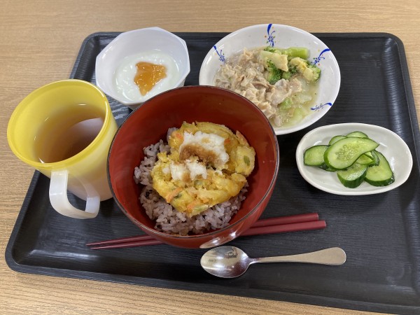 雑穀米に丸いかき揚げをのせておろしだれをかけて召し上がっていただきました。