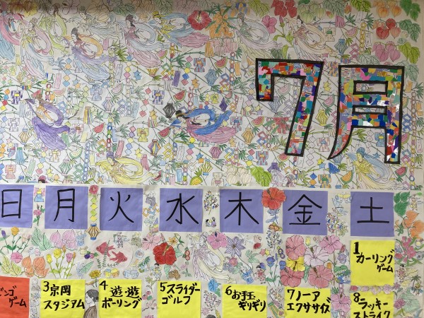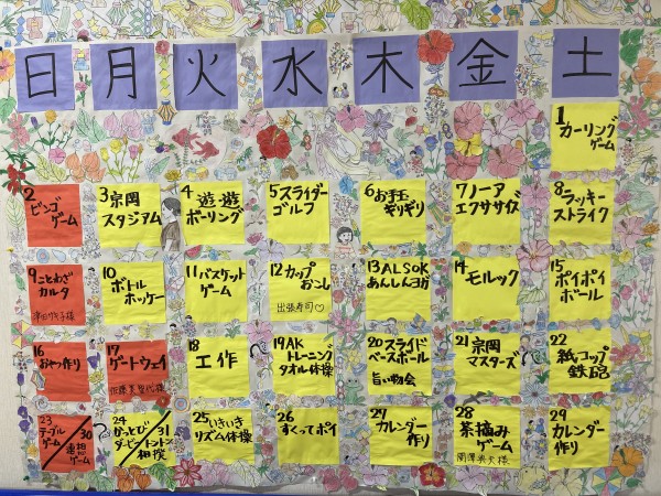 ご利用者の皆様が、レクリエーションの時間に先月に塗った塗り絵を切ったり、貼ったりしてカレンダーを作成されました。