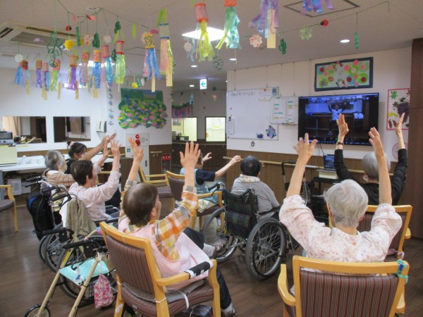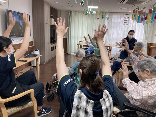 インストラクターが4階で行う健康体操をリモートで、全階同時開催する様子などです。