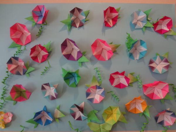色とりどりの朝顔と葉っぱを折り紙で作りました(^O^)/