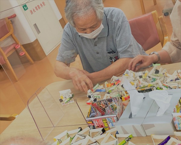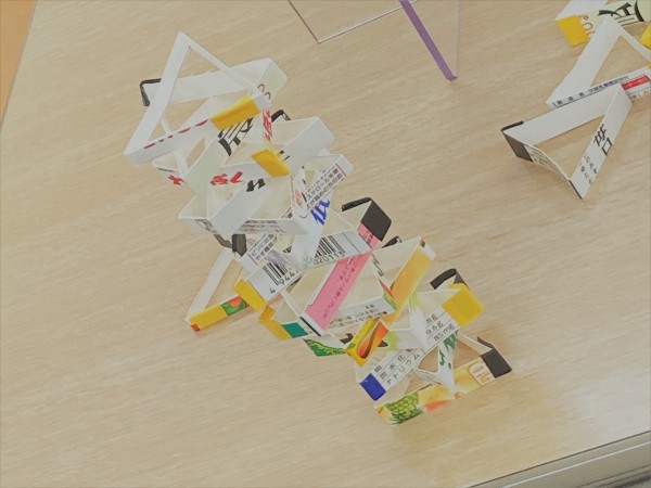 こちらですー。そう、これを見てピンと思い出しましたか?牛乳パックの積み立てとなります!崩れても時間のある限り積んでいきますよー