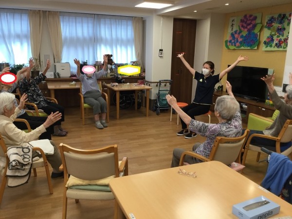 塗り絵をされているB様。また、別な日には皆さんで体操にも取り組まれていましたよ♪