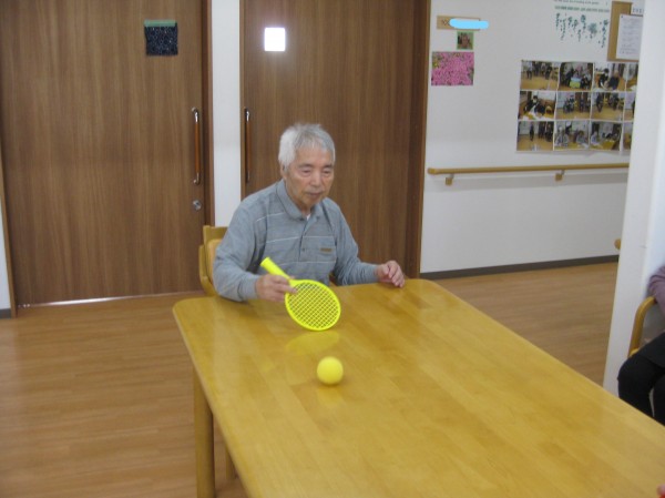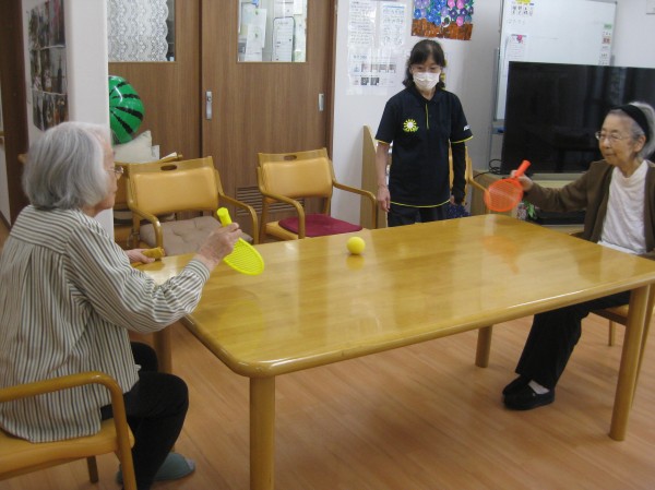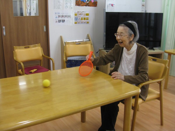 テーブルテニスで遊んでいるご様子です( ^ω^)・・・ 始めは私いいです~。違う人やって下さいと話されていましたが、やり始めると夢中になり楽しまれていました!! 良い運動になり楽しまれていました。 「疲れたわ~? でも、楽しかったです。」と話されていました(^^♪