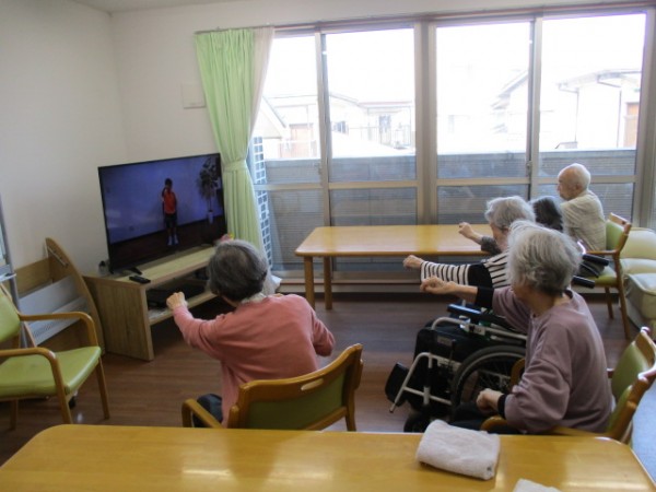 2階でALSOK体操を行っているご様子です( ^ω^)・・・ ビデオを見ながら身体を動かされています。元気に手を上げて運動されている人やそれを見ている人様々です・・・/// 手を上げて、手を振って!!に続いてに身体を動かされ頑張っています!! 頑張ったから疲れました(^^♪ と話されました。楽しまれたひと時になりました。