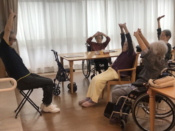 本日は暑さに負けないよう入居者様と体操レクで身体を動かしていた時のご様子を紹介したいと思います。