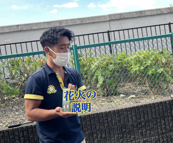花火の説明をしながら、着火する門田くん。