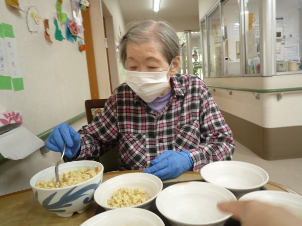 刻んだホットケーキを器に分けて