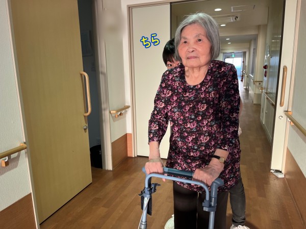 廊下で見かけたのは、シルバーカーを押しながら素敵に歩く入居者様。