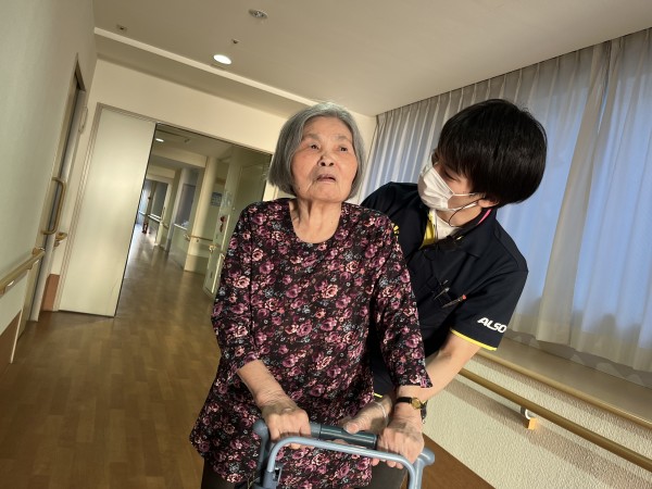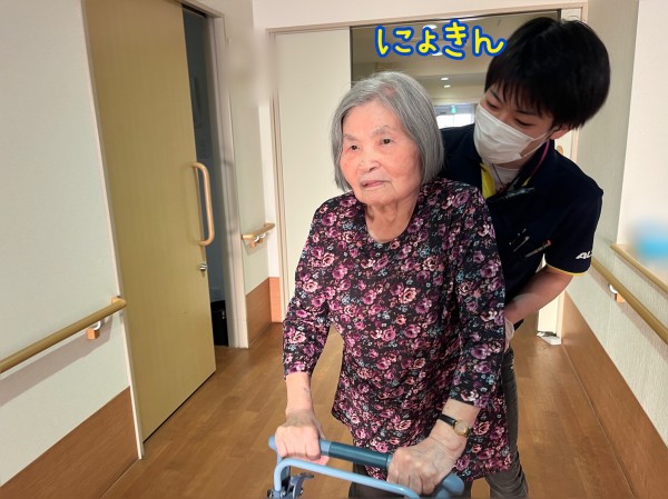 歩きながらも楽しい会話を繰り広げ、ご入居者様も元気に応えてくださいます。