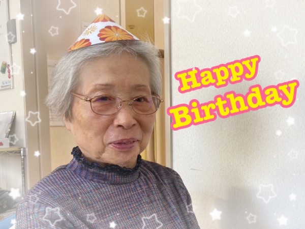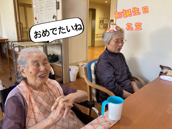 ケアスタッフの小西くんが、夜勤中にセッセと作った花笠を被ってハッピーバースデー✽