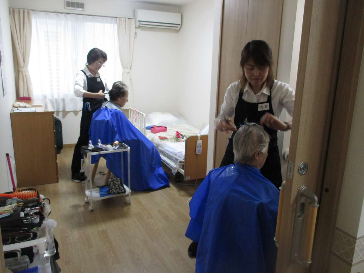 入居者様は順番に部屋に入り、美容師さんとお話しながらカットして頂きます。
