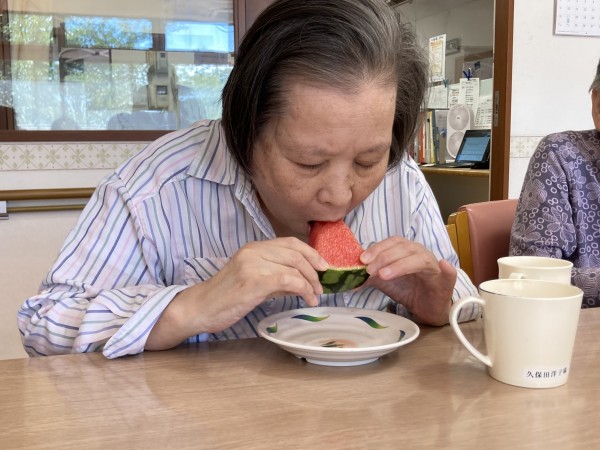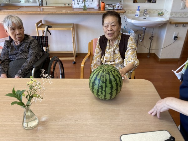 利用者様はスイカをコツン・コツンと叩き「こうやってたたいて買ったもんよネ」と話が弾んでました。