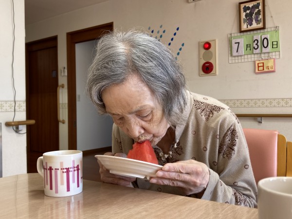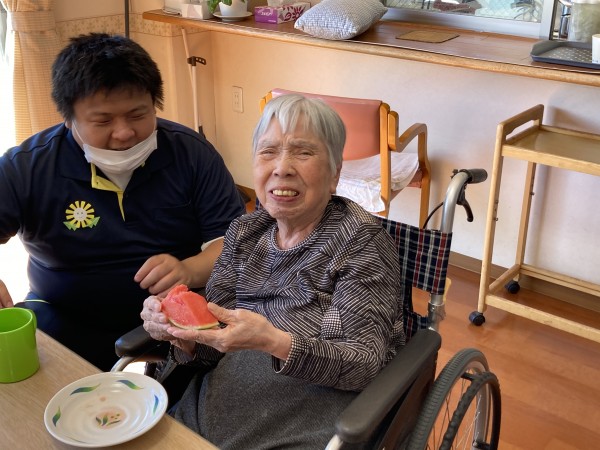 スイカを差し入れてくれた息子さんの母親である職員はグループホームに入っても、今まで家でやってきたことが出来るのがグループホームの良い所…と常に話をしています。