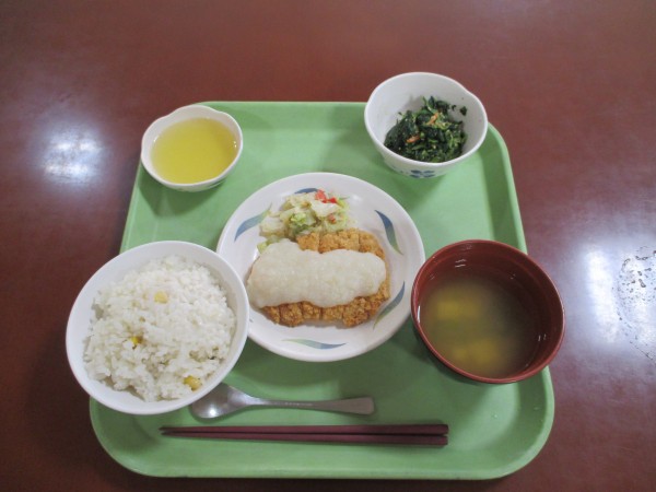 下の写真が☆納涼メニュー☆・もろこしご飯・味噌汁・おろしとんかつ・ほうれん草のピーナツ和え・梅ゼリーです☆