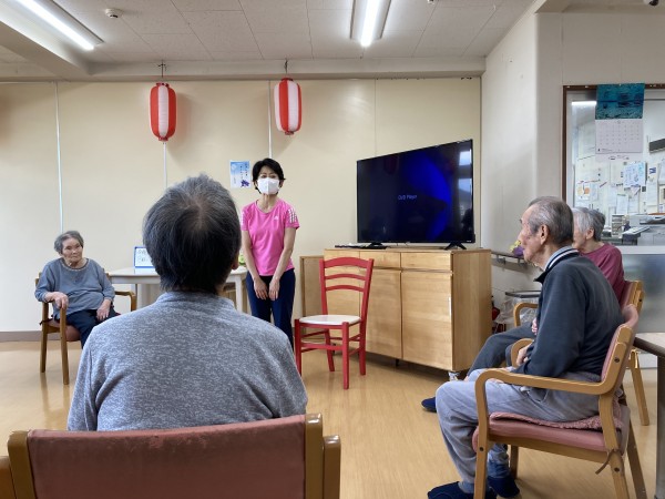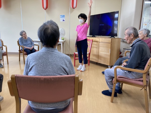ALSOK介護の施設では、からだをうごかして元気に過ごしていただくために毎日体操をする時間があります。健康増進のためにオリジナルのDVDがあり、そこに何種類かの体操が収録されています。そのDVDを流しながらスタッフと一緒に体を動かしています。