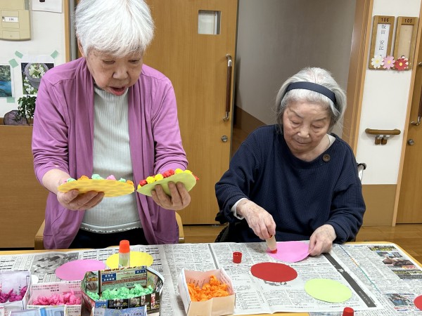 先日1階の入居者様のコロコロお花紙を丸めて頂いた物を使って今日は2階3階の方もお誘いして【工作レク】を行いました。
