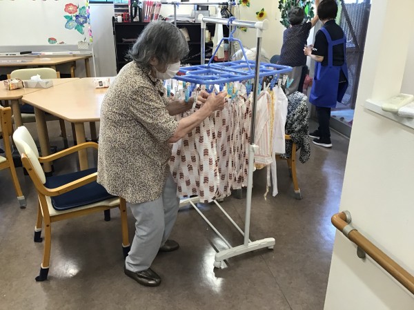 ・13:00~14:00食事・コーヒータイムも終わり生活リハビリが始まります。皆様が使ったエプロンやタオルの洗濯干し・食器拭き)