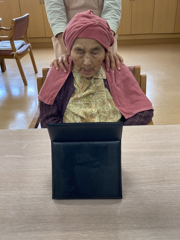 訪問マッサージのフェイシャルエステ。。。とっても気持ちよさそうなんです(≧▽≦)施術をうけられているご入居者様皆さまうっとりされています。