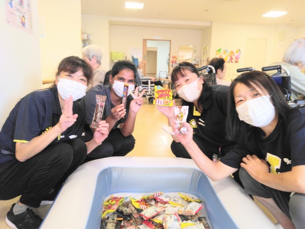 ということで、本日は急遽、「秋の駄菓子釣りゲーム」を開催! 食欲旺盛な皆様のために お菓子をいっぱい食べて お腹を満たして頂くことにしましたー!!