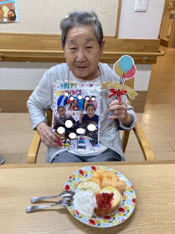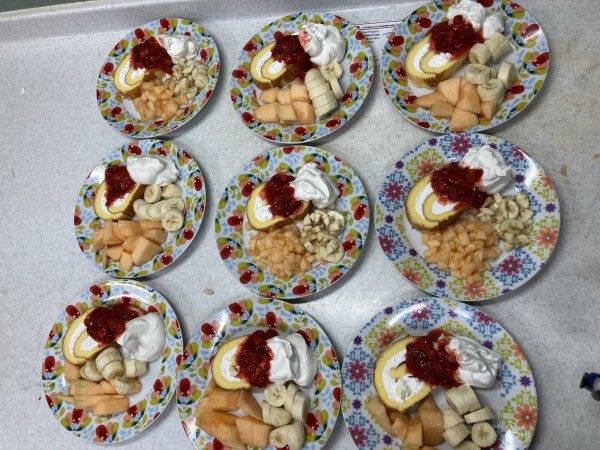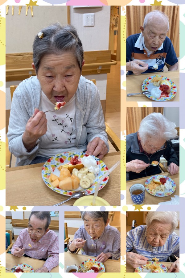 ロールケーキ、バナナ、メロン、たっぷり生クリームにイチゴソースを添えて(^ω^)お祝い致しました(^^♪