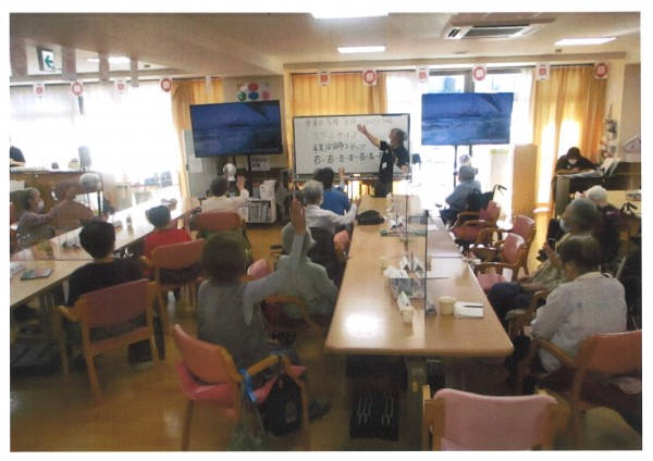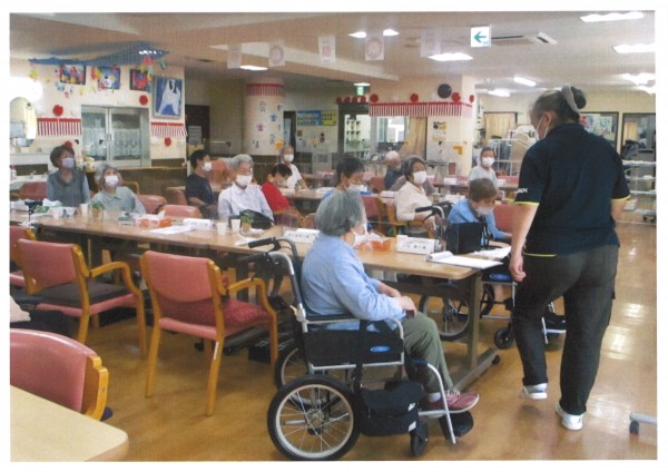 椅子に座ったまま、カウントをかけながら運動することにより、脳の血流が良くなるというエクササイズ。柴田職員の元気な声に自然と身体が動いてしまいますね。しっかりと運動した後は冷たい麦茶が体と喉にしみわたります。