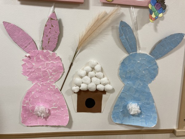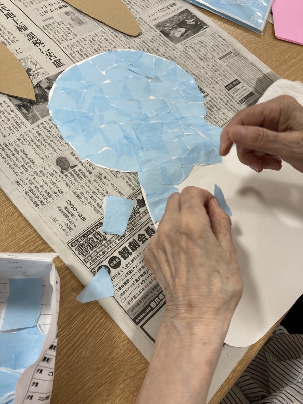 ピンクと水色の折り紙を小さくちぎって型紙に貼っていきます(^o^)指先を使って細かい作業ですね♡