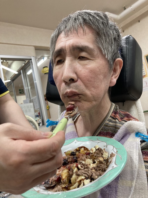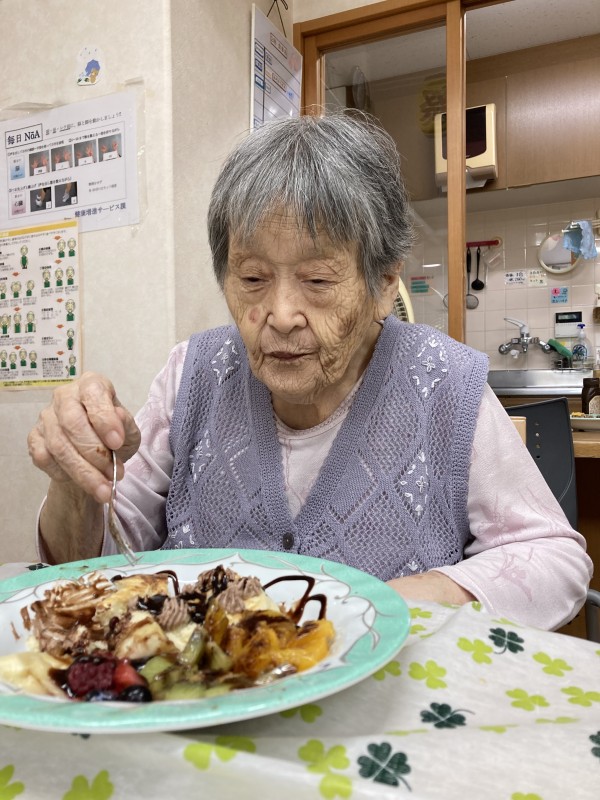 チョコのクリームにフルーツを添えて頂きまた。クリームを口の周りにつけて「美味しかった」と仰られておりました。(^_-)-☆