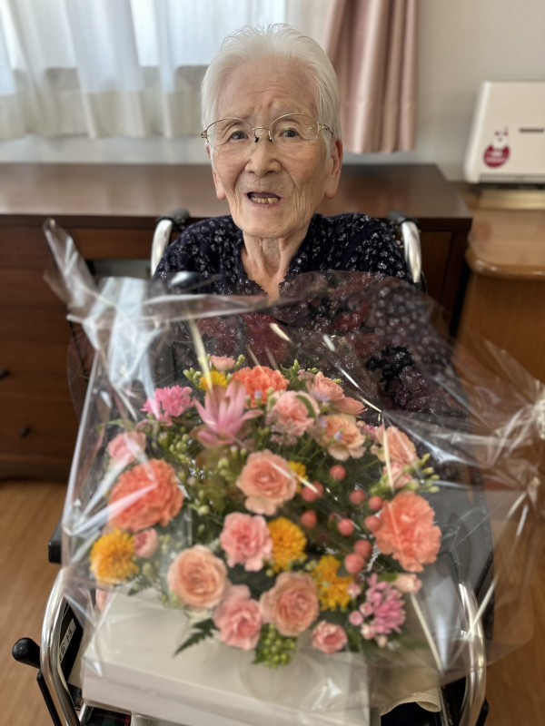 『敬老の日』のプレゼントのフラワーアレンジメントをご家族様からプレゼントされ、とっても素敵な笑顔のO様♡