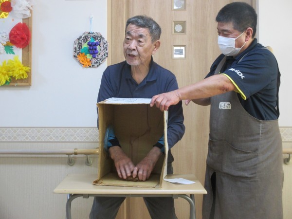 恐る恐る目に見えない野菜、たわし等触って当てていただくゲームです。