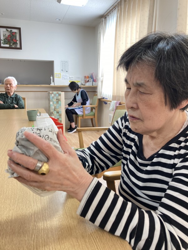 まずは新聞紙を丸めます♪花紙で包みそれを6個作り、輪ゴムで留めます♪