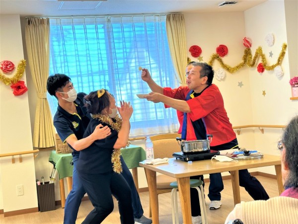 介護の現場で日々鍛えられているチームワークを魅せる絶好の機会になる筈でしたが、アツアツのおでんは無情にも職員の顔面に(笑)