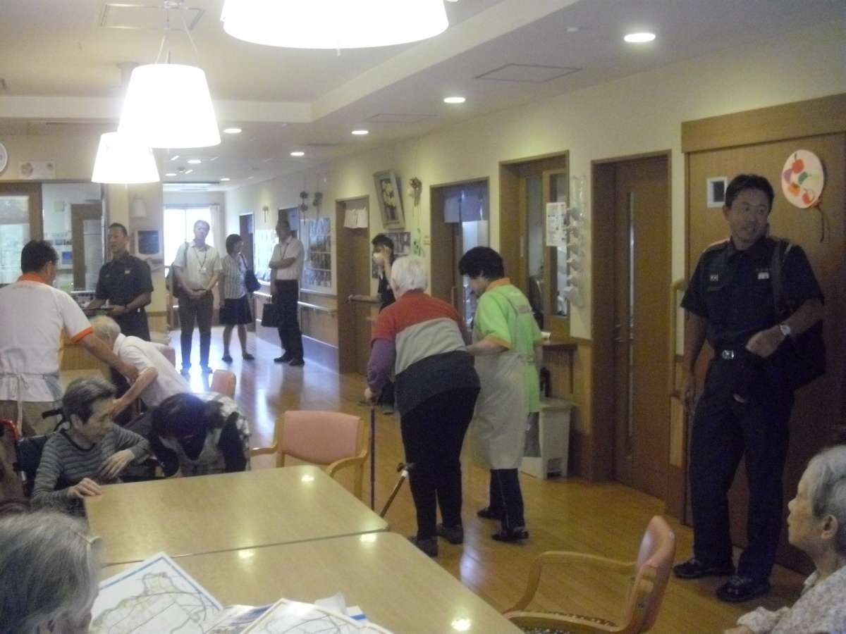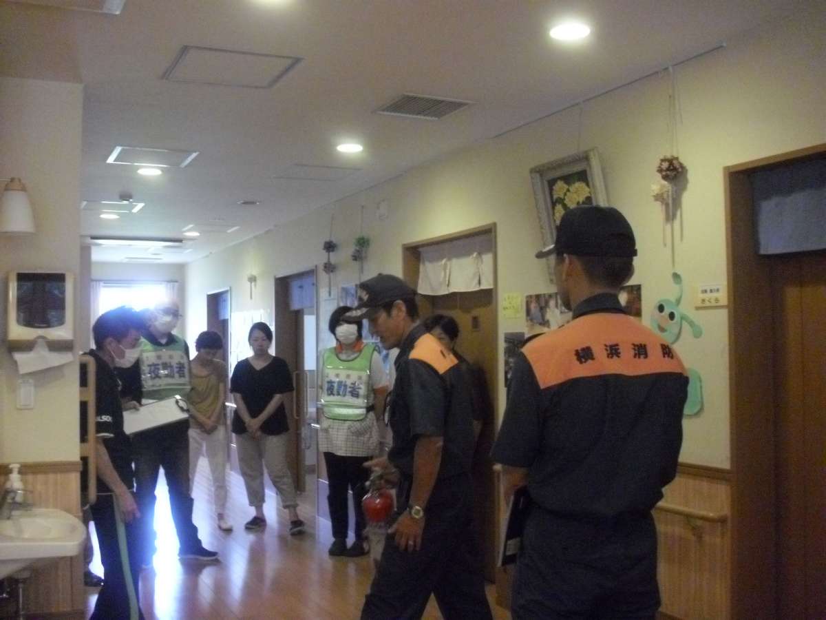 7月27日 みんなの家・横浜上瀬谷にて、消防署員、横浜市職員、地域他ホームの方の立ち会いのもと、消防署員指導にて火災・風水害の避難訓練を実施しました。