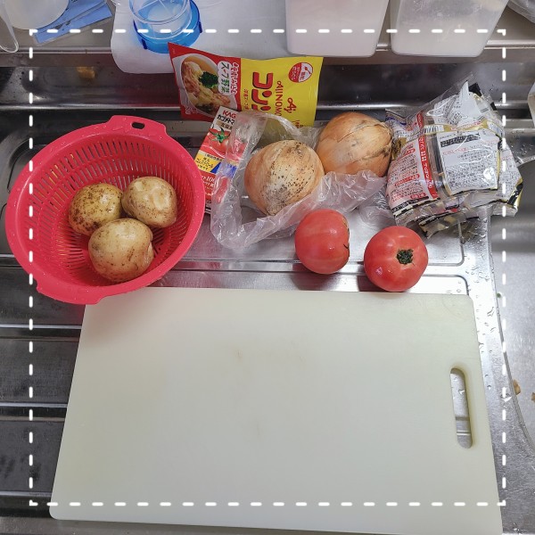 おやつレクの材料は・トマトジュース・トマト・ジャガイモ・玉ねぎ・ウインナー・コンソメ・塩コショウ・ニンニク・お酒