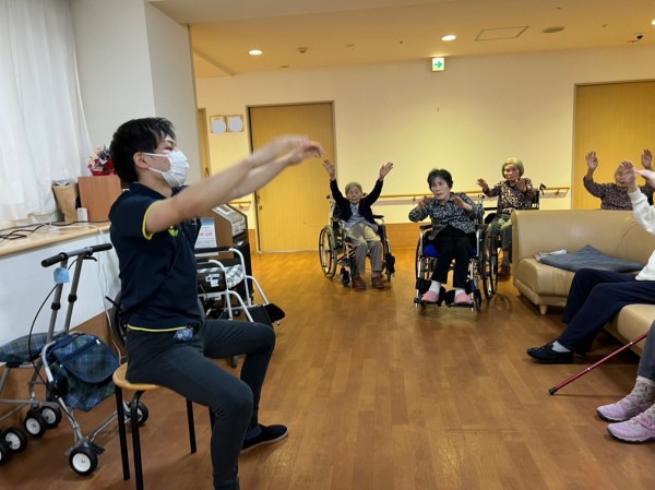すこや家・西尾久に来る前は体操をやった事がない職員さんも頑張ってやるようになります。