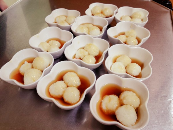 あとは、職員が作ったみたらし餡をかけて、みたらし団子にしましたぁ。