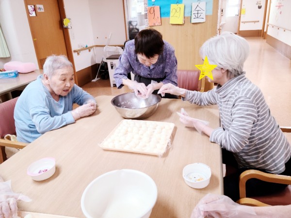 今回は、2階と4階の料理上手なご利用者様に集結して頂き、約90個位のお団子を作ってもらいましたよ\(◎o◎)/