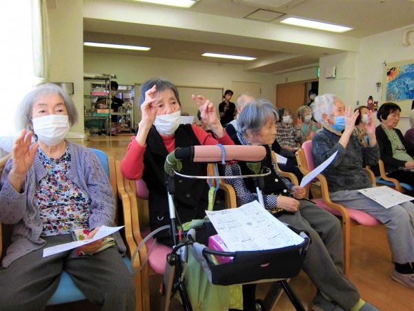 「ふるさと」の演奏に合わせ、手指の体操を行う場面も。