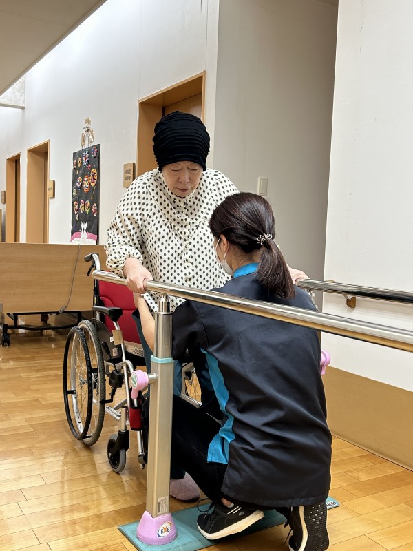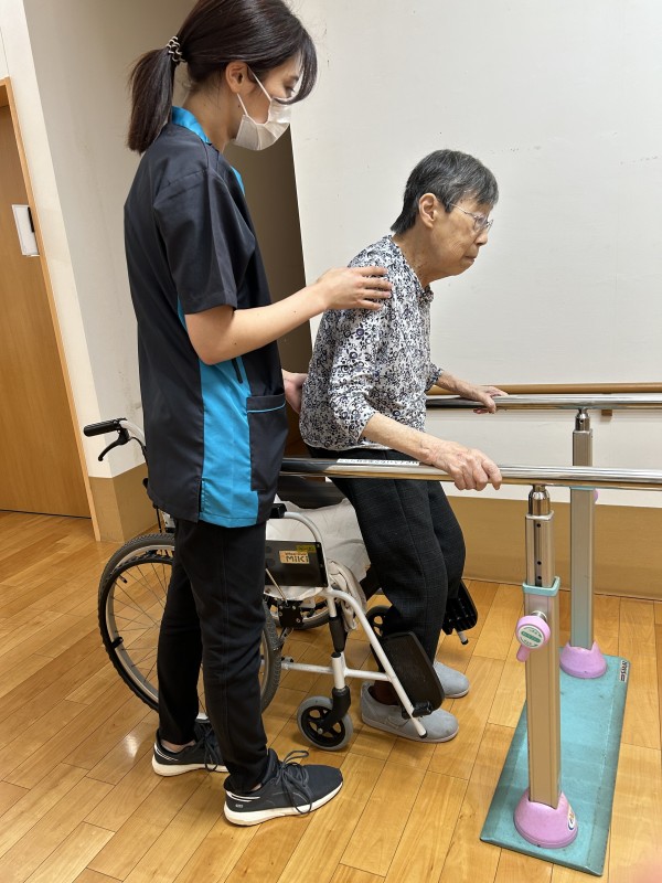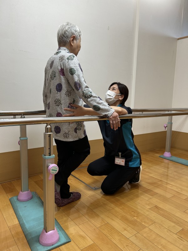 元々姿勢正しく綺麗に立っていらっしゃるですが、平行棒を使って片足立ちの訓練や歩く時の視線の位置などをPTさんからアドバイスを受けた後は、益々胸をはり颯爽と歩かれていました。