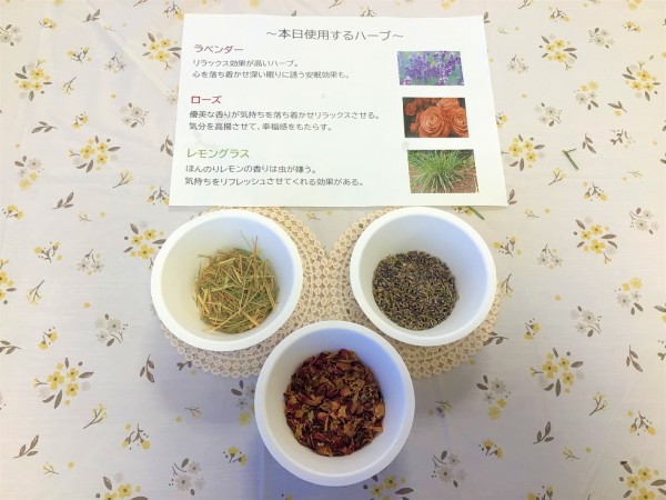 本日のメニューは、ラベンダー、ローズ、レモングラス。