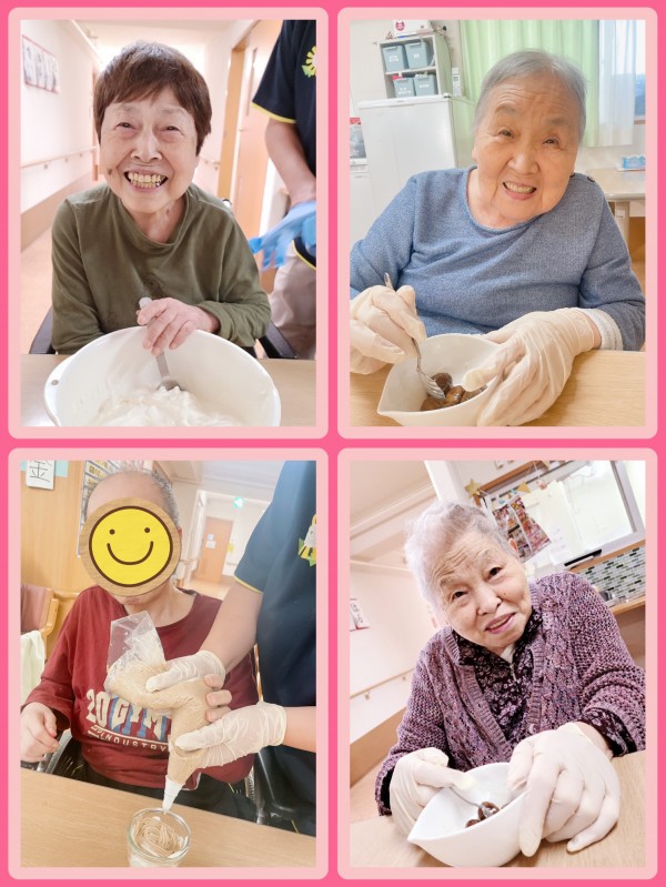グループホームみんなの家大宮三橋 10月の2階おやつ作り 秋と言えばやっぱり栗でしょ!美味しいモンブラン作り