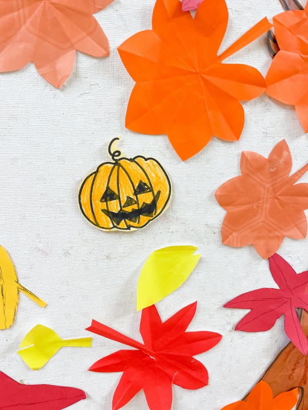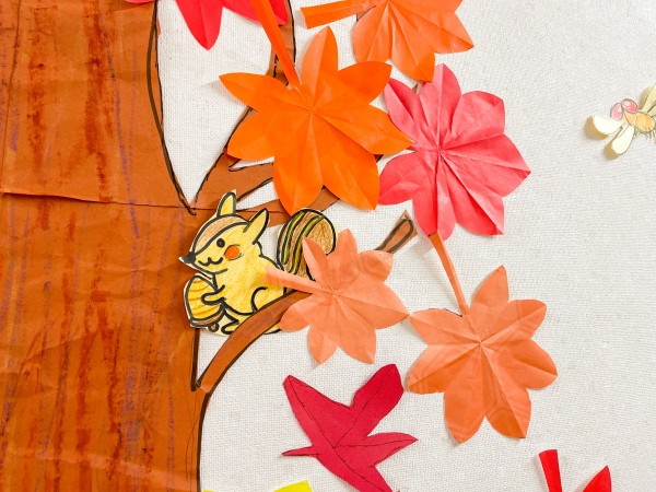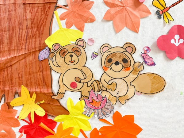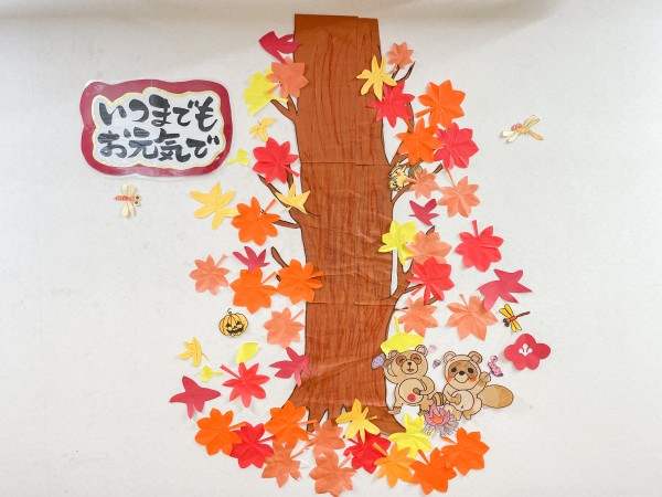 お菓子の包装紙で作った紅葉の他にもS職員が描いた動物やジャックオーランタン!
