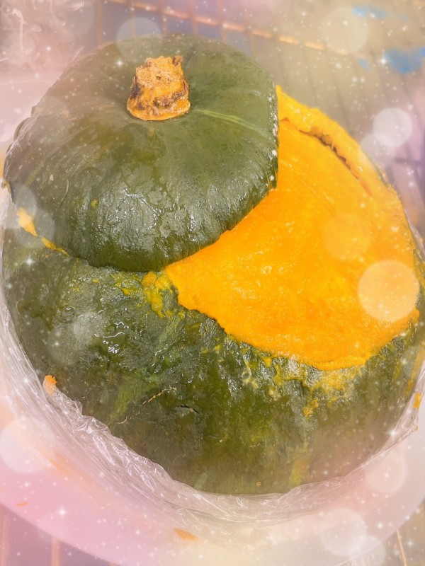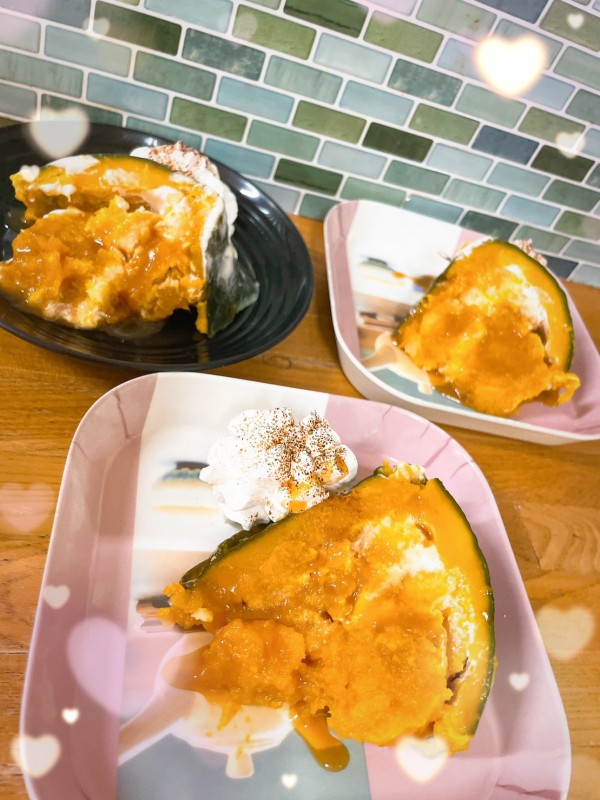 (レンジで柔らかくしたカボチャの中身をくりぬき、スポンジケーキと生クリームとカボチャのペーストを詰めて冷しました。)