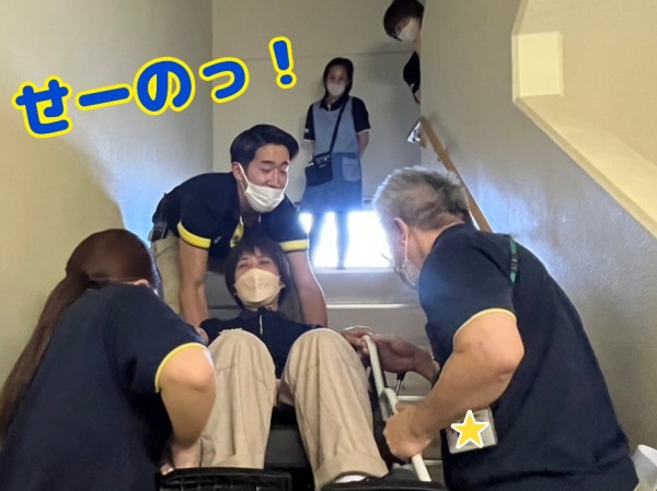 浸水から逃れるために、下の階のご利用者様を車椅子で階段を上がる想定です。