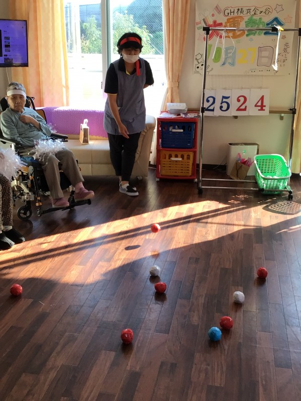 真ん中に置いた青い玉に向かって皆で投げ、近い方の勝ちです☆