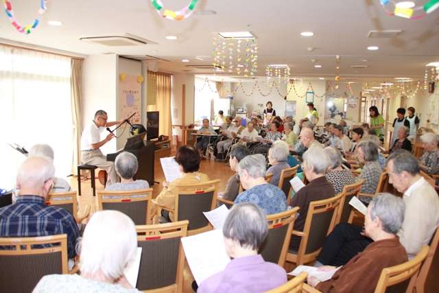 8月19日(日) 朝晩、秋の気配を感じる日々となりました。介護付有料老人ホームすこや家・西東京3Fフロアにおきまして、ほのぼのコンサートを開催しました。 ギターそしてピアノを演奏して下さったのは坂上様です。今回で3度目になります。選曲される曲は、いつも、歌ってみたいな…、聴いてみたいな…という曲ばかりです。曲と曲の合間のトークは軽妙で、歌と同じように聞き入ってしまいます。ご利用者様も、皆様楽しそうな表情をされていました。トークの中で、「浜辺の歌」はラブレターだということを知りました。こんな素敵な詩を贈られたら、心を奪われてしまいますね。 日々の暑さで心まで夏バテしそうでしたが、コンサートが終わった後は、フンワリした気持ちになりました。