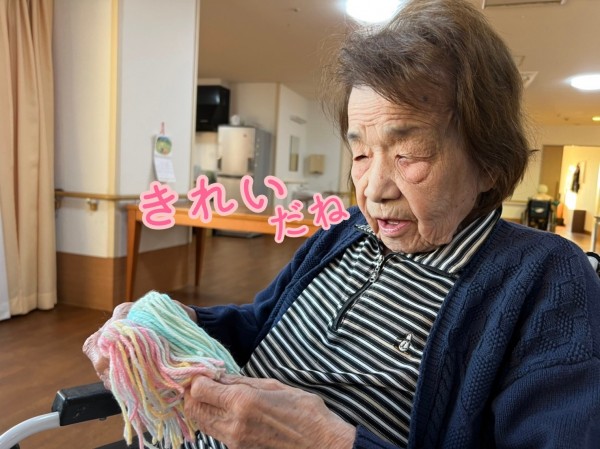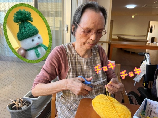 雪だるまさんのお帽子になる毛糸を、チョキチョキ