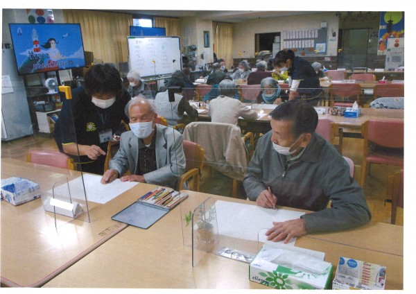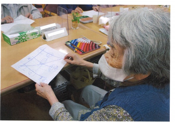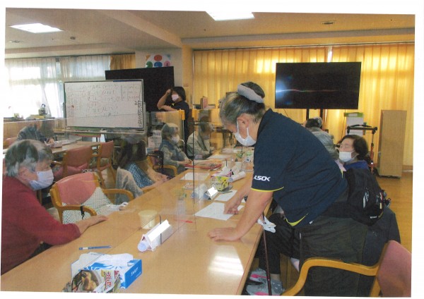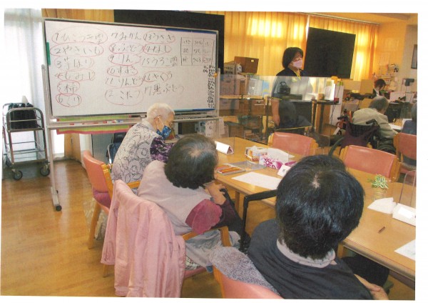 本日午後のレクリエーションは【手作りビンゴゲーム】です。自分でビンゴの用紙をつくって楽しむビンゴゲーム、ホワイトボードに書き出した言葉から選び用紙に記入します。今回のお題は果物、たくさんの果物の中から選んで書き込むのでよく考えないとなかなかビンゴ出来ません。何を中心にするか、でも結果が変わってきます。景品もでないビンゴですが『リーチ!』『リーチ‼』と方々から声が上がりとても盛り上がります。ビンゴするとうれしいですよね♪