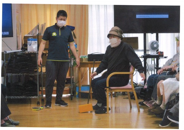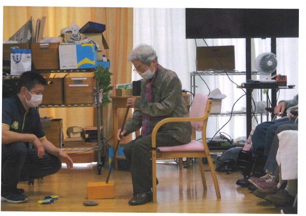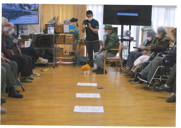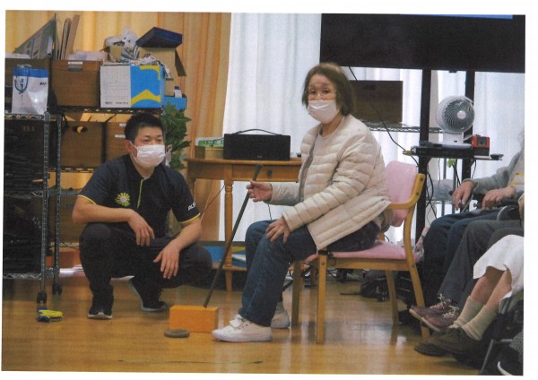 本日午後のレクリエーションは【ホールでゴルフ】です。職員お手製のクラブとボールでなんちゃってゴルフ、距離でポイントを競うのですが強すぎればOB、弱すぎればOBと絶妙な力加減が必要なゴルフです。本来のゴルフとは全く勝手が違うので、ゴルフ経験は関係ありません。力がなくてもクラブを振ってボールに当てることさえできればポイントが取れるので誰でも楽しめます。職員が思いっきり空振りして大爆笑が起こっていました、今日も楽しく盛り上がりました♪